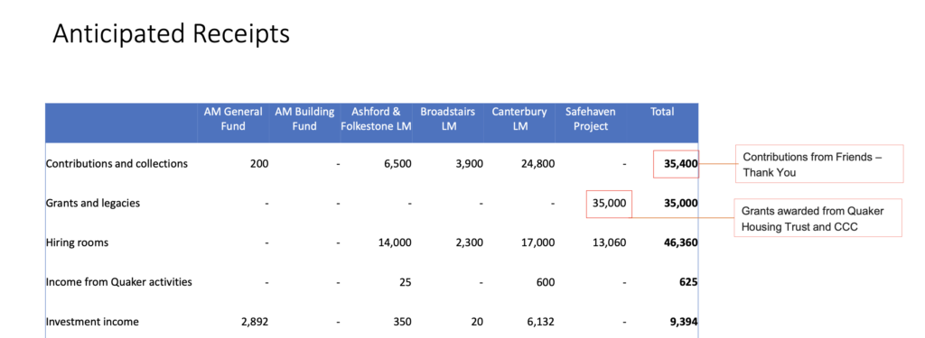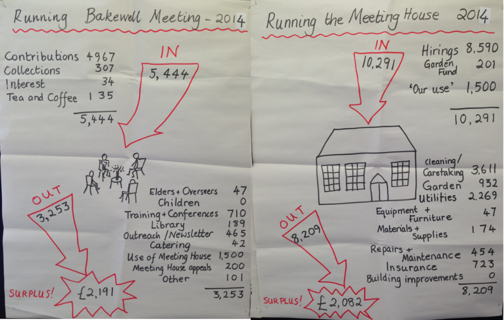 The flipchart ‘end of year accounts‘ for Bakewell Meeting in 2014 lists out the totals spent for each of the categories that were felt to be important for everyone to see and understand.
